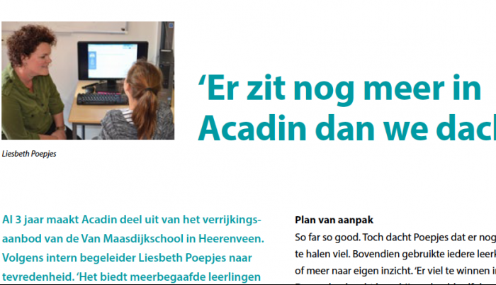 Al jaren maakt Acadin deel uit van het verrijkingsonderwijs in de Maasdijkschool te Heerenveen. Aan het woord intern begeleider Liesbeth Poepjes.